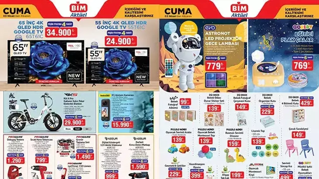 BİM mağazalarında bu hafta satışa sunulacak Nisan ayı ilk aktüel kataloğunda yer alan ürünler vatandaşların yakın takibinde yer almaya devam ediyor. Bu hafta BİM aktüel kataloğunda yer alan ürünler arasında Kalın Teker Elektrikli Bisiklet, TCL TV, X3 Aksiyon Kamerası, Akülü Araba Çeşitleri, Anne-Bebek Ürünleri yer alıyor. İşte BİM aktüel kataloğunda satışa sunulacak ürünlerin tam ve eksiksiz listesi...