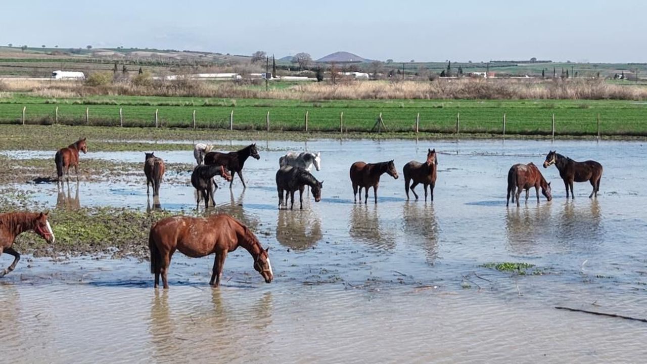 Uluabat Gölü, Bursa-İzmir kara yolunun kıyısına kadar gelirken bölgede bulunan milyonluk yarış atlarının bulunduğu tarlalar da su altında kaldı. Arap ve İngiliz yarış atları, su içinde gezinirken drone ile görüntülendi. Milyonluk tayların annesi olan damızlık atların büyük kısmının gebe olması da dikkat çekti.