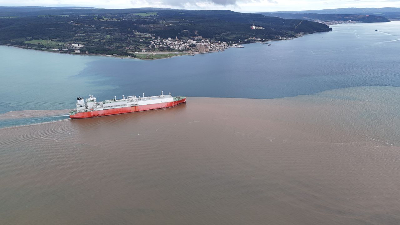 Çanakkale Boğazı’nda sağanak yağışın ardından denizin bir bölümü, farklı noktalardan boğaza ulaşan çamurlu sular nedeniyle kahverengiye büründü. Renk değişimi, sabahın ilk saatlerinde dron ile havadan görüntülendi.