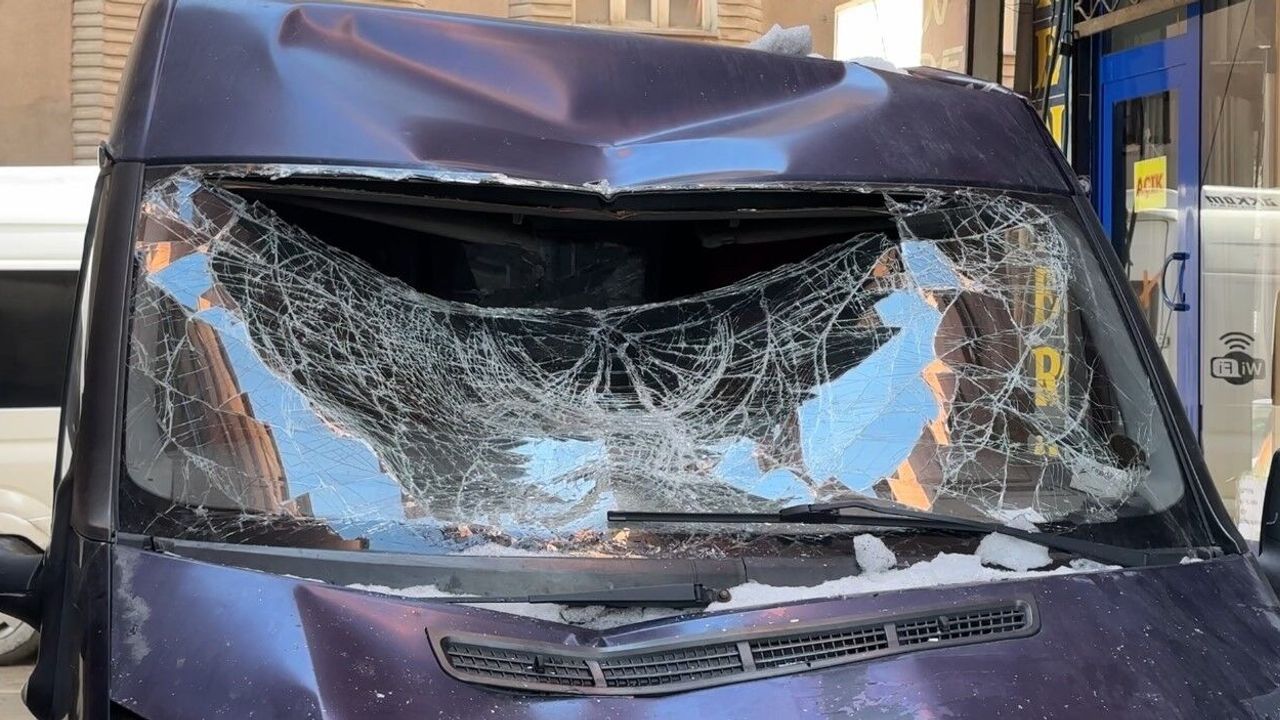 Hakkari’nin Yüksekova ilçesinde bir binanın 7’nci katından düşen kar kütlesi, seyir halindeki minibüse zarar verdi.