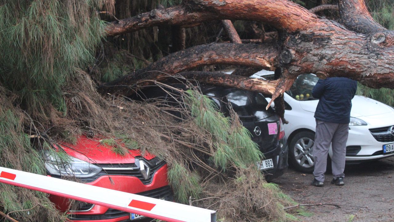 Aydın’ın Efeler ilçesinde hastane bahçesinde bulunan dev çam ağacı, park halindeki araçların üzerine devrildi. Olayda şans eseri yaralanan olmazken, araçlarda büyük çaplı maddi hasar meydana geldi.