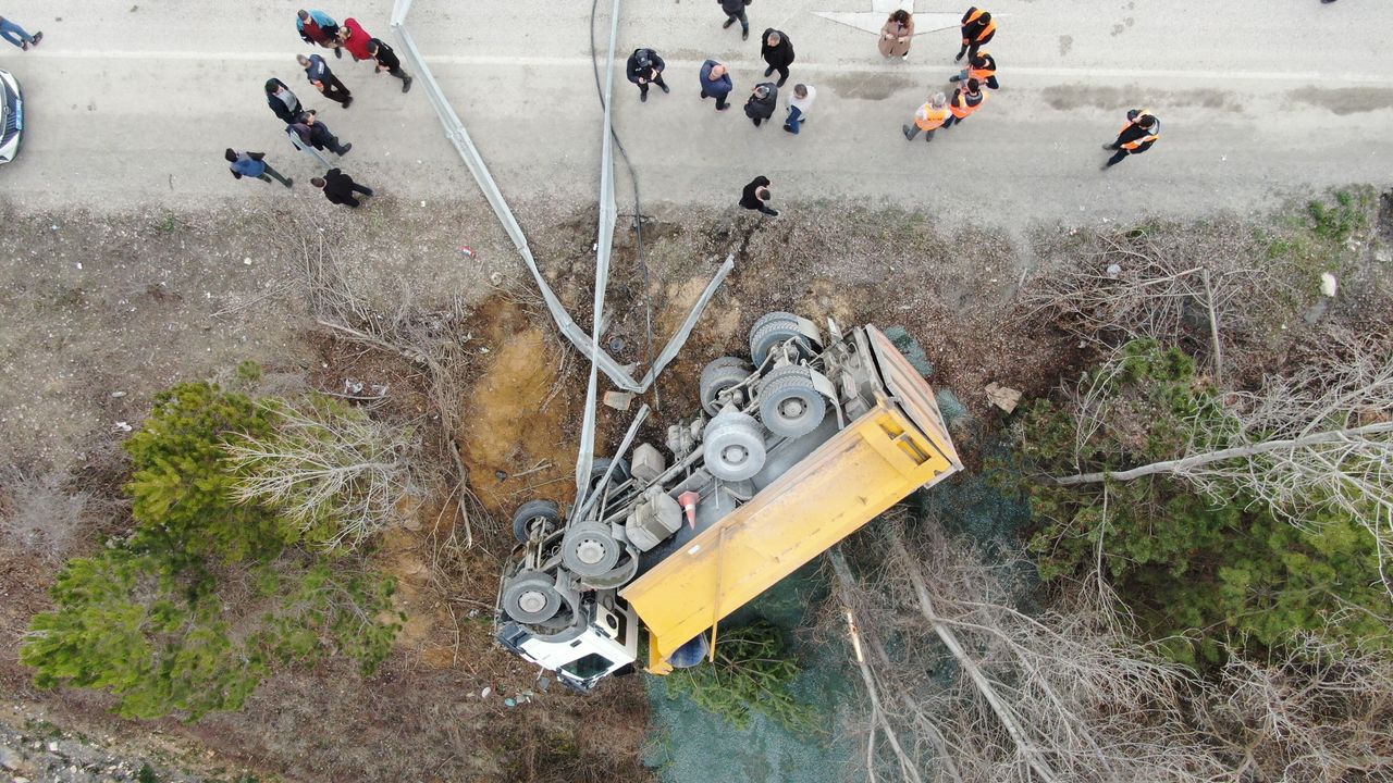 Devrilen hafriyat kamyonu ise vinç yardımıyla bulunduğu yerden kaldırıldı.