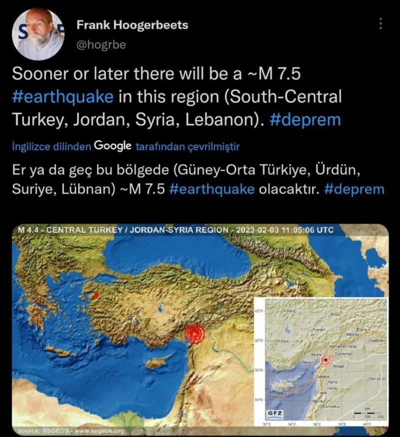 "Er ya da geç bu bölgede (Türkiye'nin Güney-Orta bölgesi, Ürdün, Suriye, Lübnan) 7,5 büyüklüğünde bir deprem olacak."