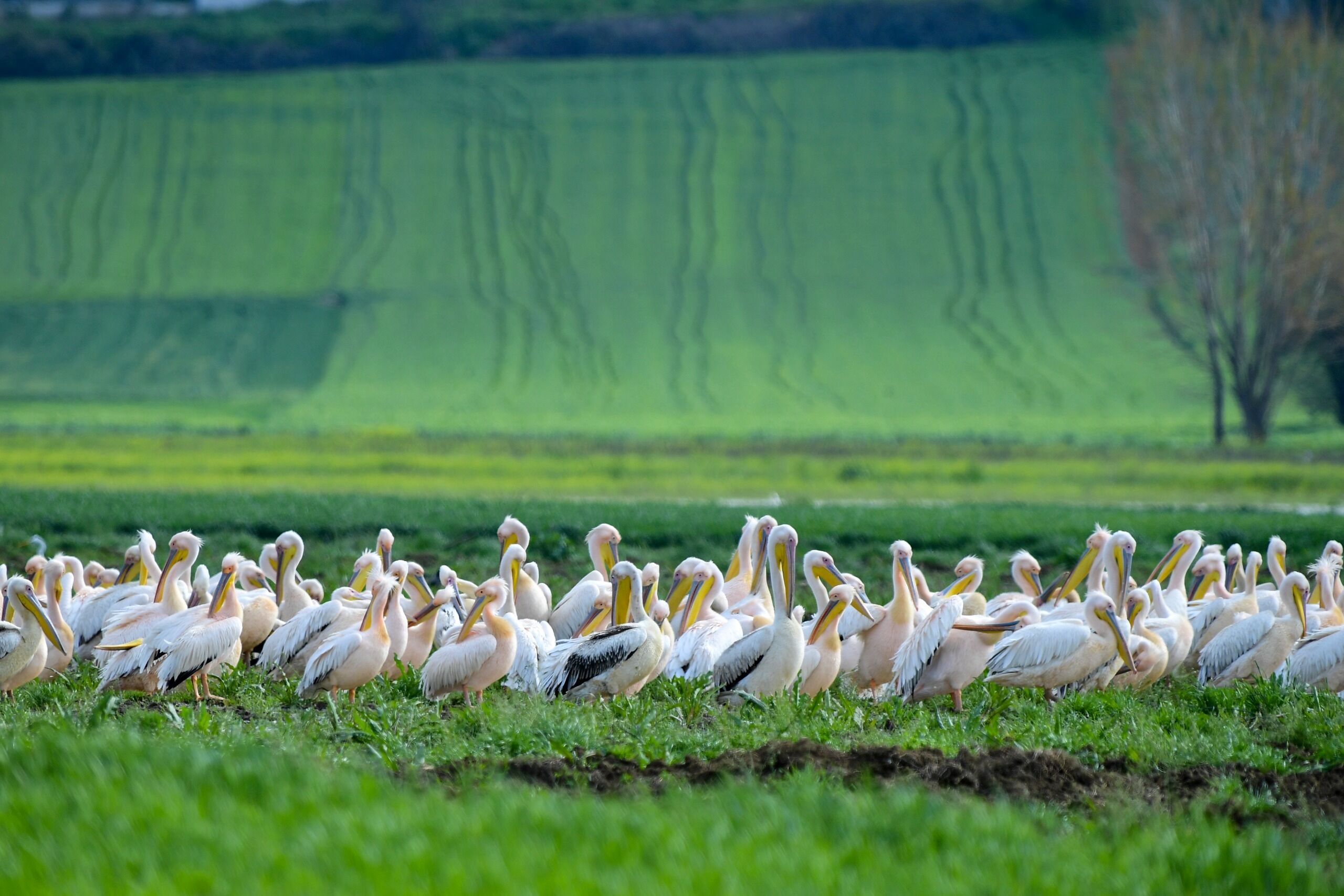 Boğazköy Barajı çevresindeki uygun habitatı değerlendiren pelikan sürüsü, bölgedeki doğal yaşam döngüsünün bir parçası olarak yeşil alanlarda vakit geçirdi.