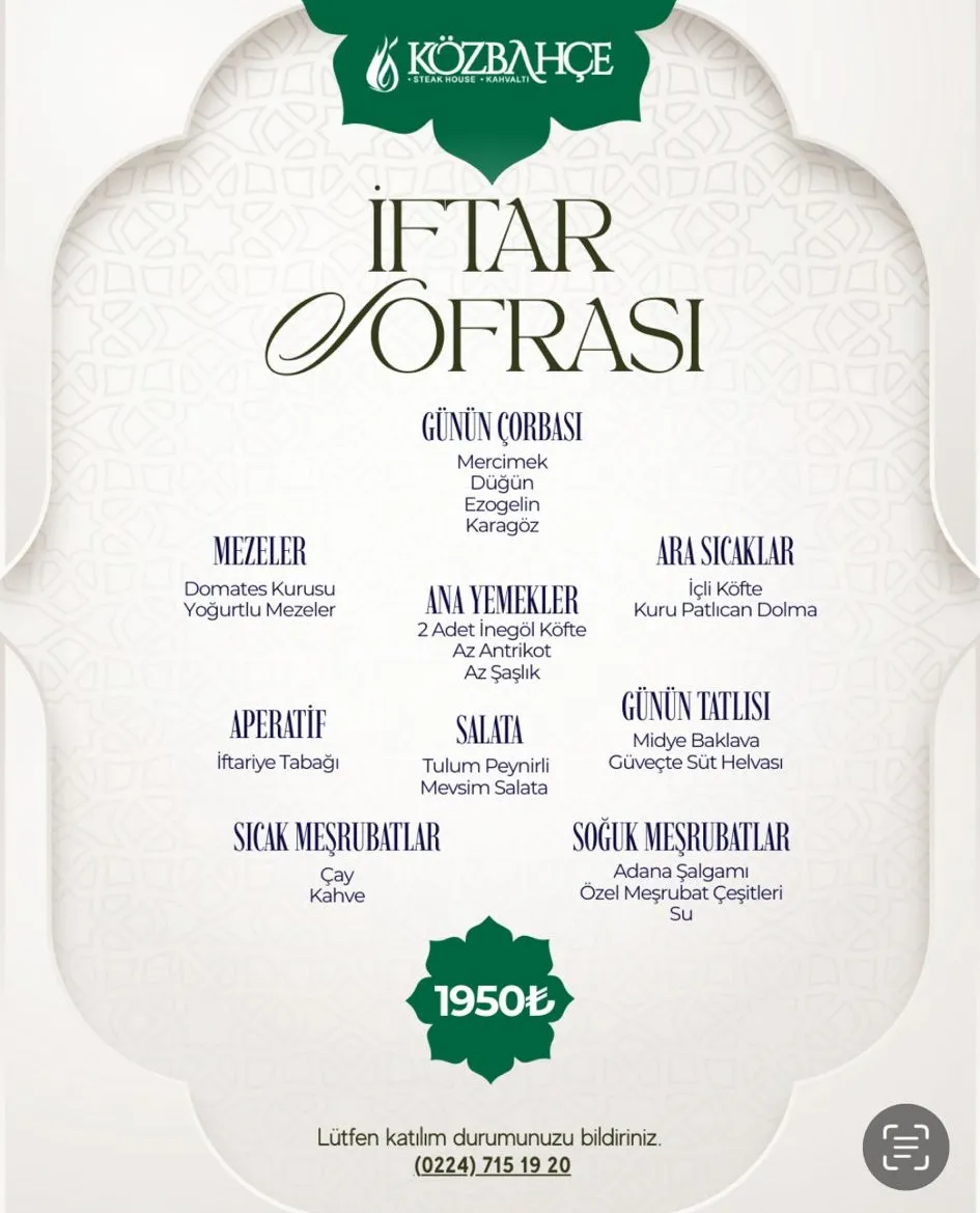 Ramazan ayının yaklaşmasıyla birlikte İnegöl’de iftar menüleri netleşti. İlçenin farklı noktalarında hizmet veren restoranlar, çocuk menüsünden karışık ızgaraya kadar uzanan seçeneklerini kamuoyuyla paylaştı. Menü fiyatlarının 500 TL’den başlayıp 1.950 TL’ye kadar çıktığı görüldü.