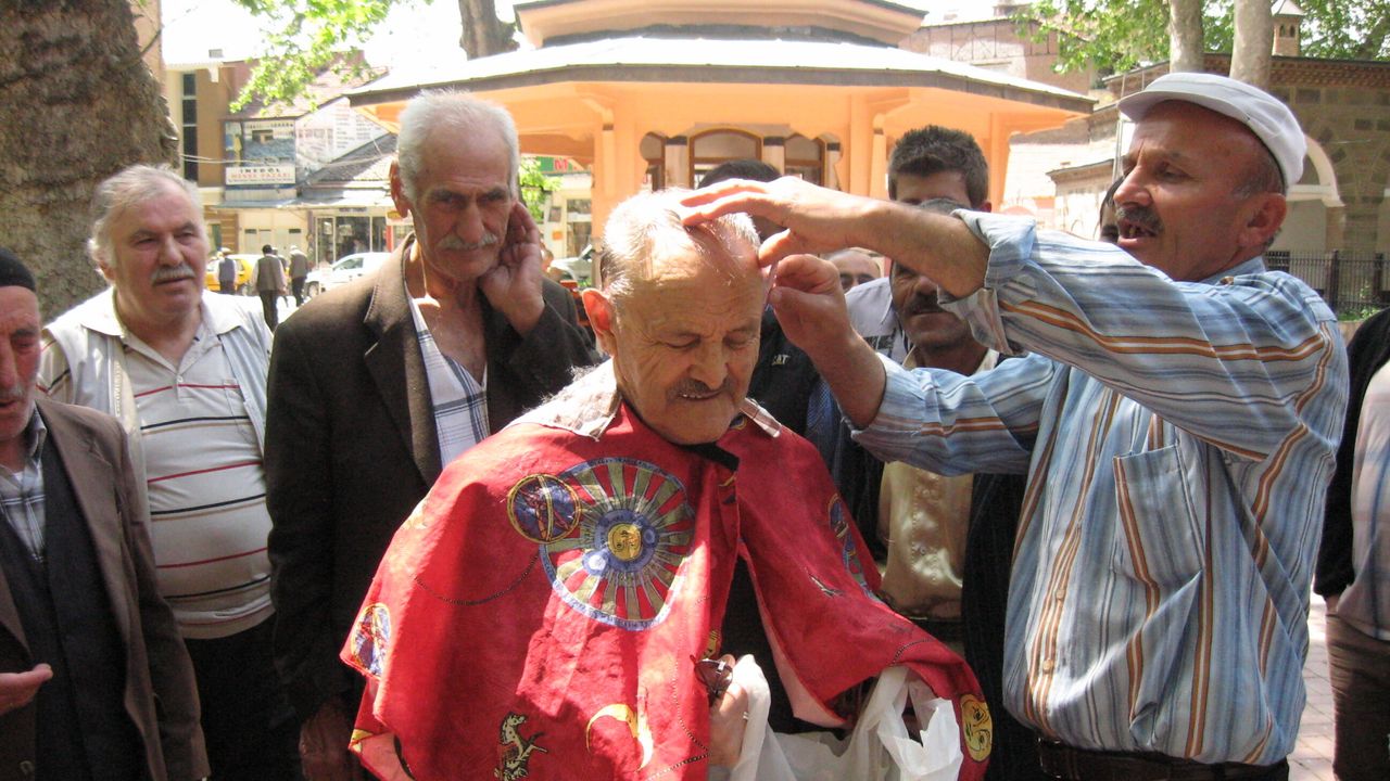 Tarih: 04 Nisan 2008. O tarihte İshakpaşa Camii avlusunda çevresine vatandaşları toplayan bir işportacı, 2 YTL’ye sattığı jilet takılı tarağı bir vatandaş üzerinde uygulamalı olarak tanıtır.