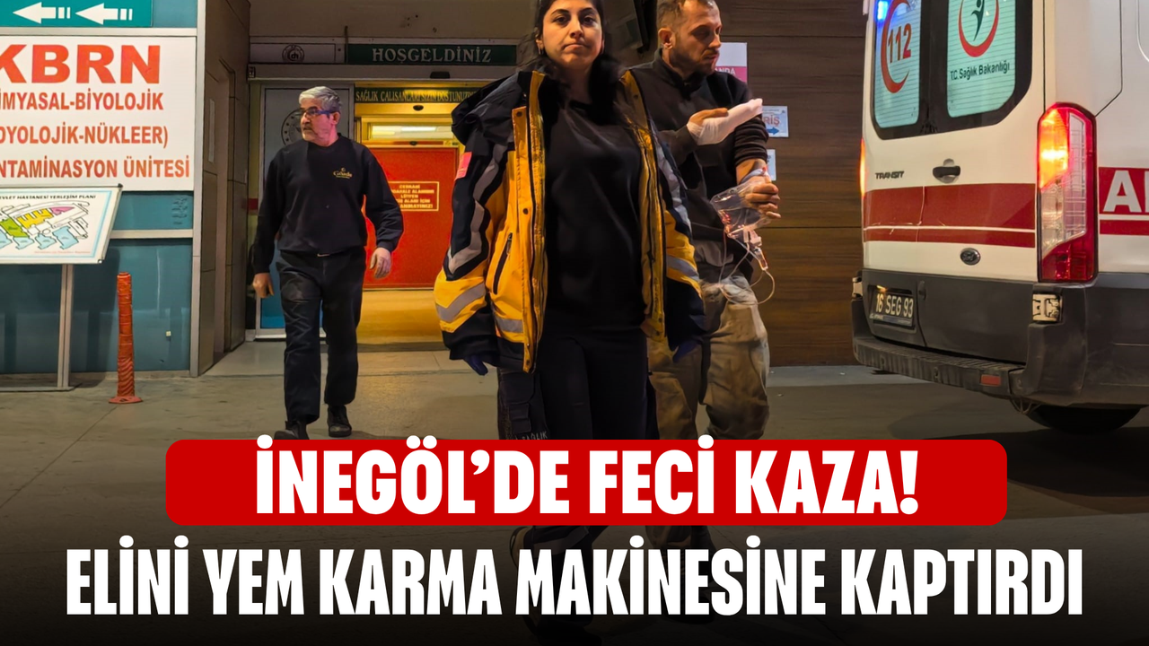 İnegöl'de bir çiftlikte meydana gelen kazada, yem karma makinesine elini kaptıran genç yaralandı.
