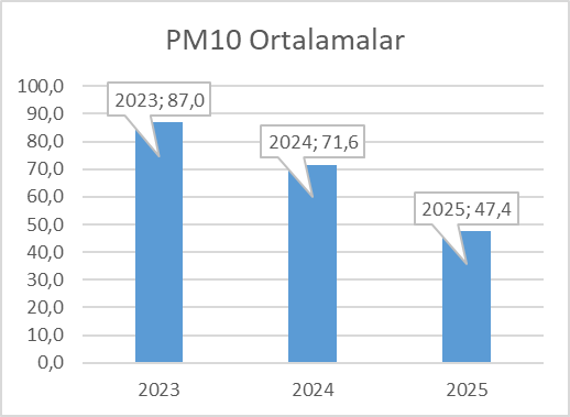 PM10 değerlerinde de benzer bir düşüş yaşandığı belirtildi. Buna göre PM10 ortalaması 2023’te 87,0, 2024’te 71,6 olurken, 2025 yılında 47,4 olarak ölçüldü. PM10’un daha büyük toz ve üretim kaynaklı partikülleri, PM 2,5’in ise daha küçük ve duman kaynaklı partikülleri ifade ettiği hatırlatıldı.