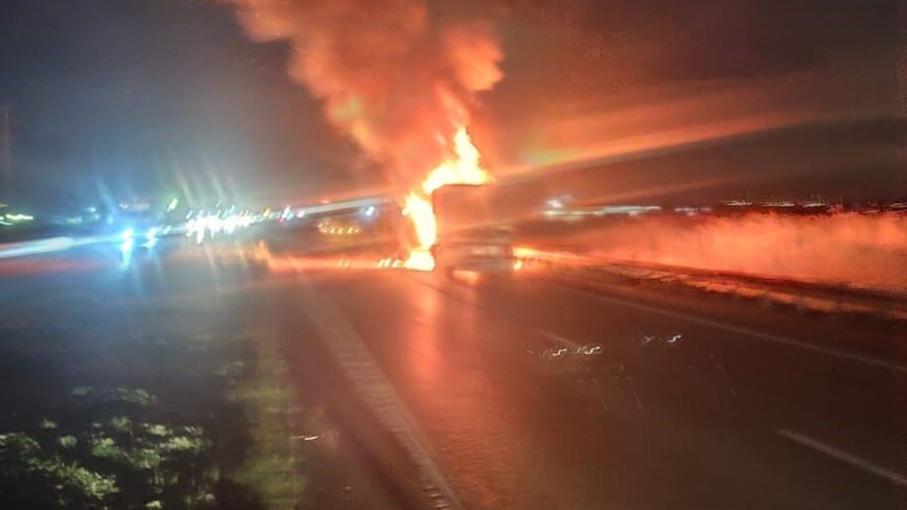 Alevler ve yükselen yoğun duman, yoldan geçen sürücüler tarafından cep telefonu kameralarıyla görüntülenirken, yangın nedeniyle yol bir süreliğine trafiğe kapatıldı.