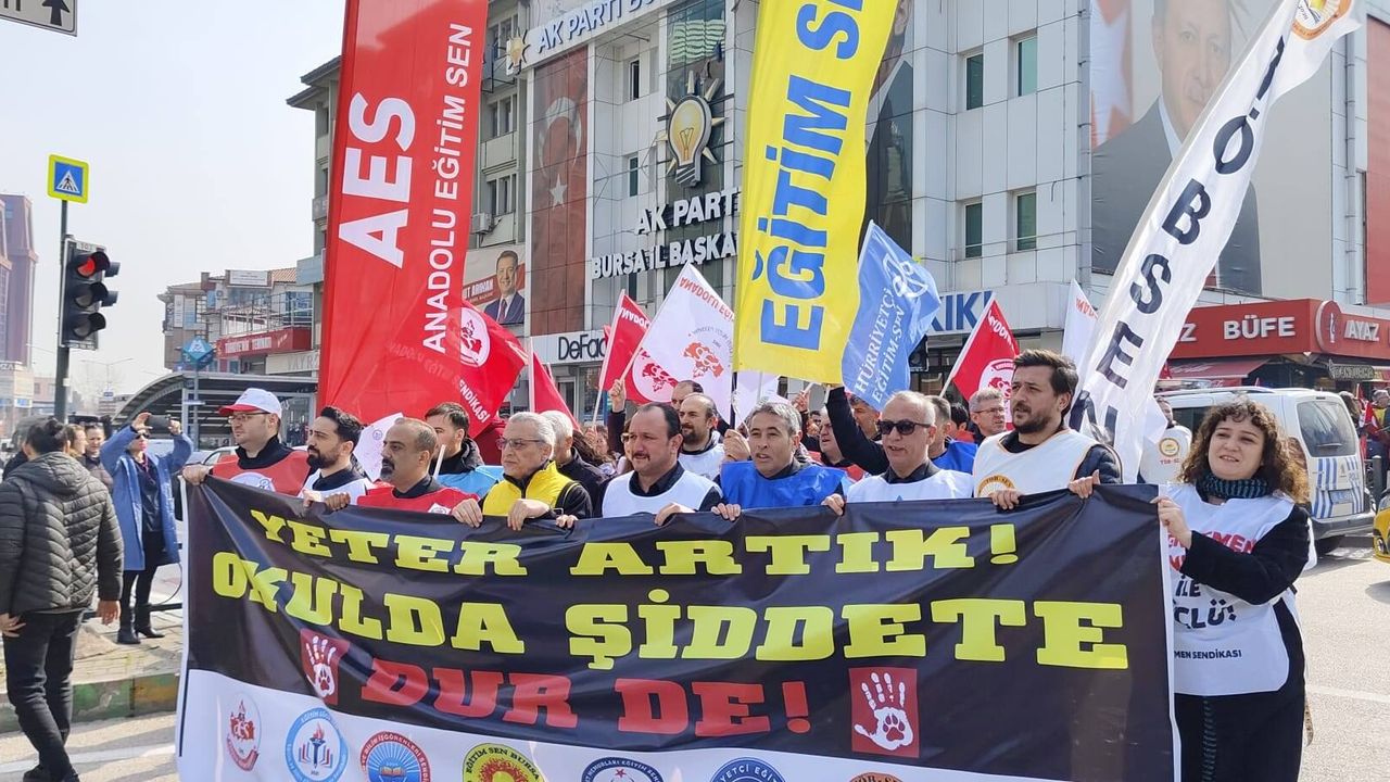 İstanbul’un Çekmeköy ilçesinde öğretmen Fatma Nur Çelik’in okulda uğradığı bıçaklı saldırı sonucu hayatını kaybetmesinin ardından Bursa’daki eğitim sendikaları okullarda şiddete son verilmesi çağrısıyla yürüyüş düzenledi.