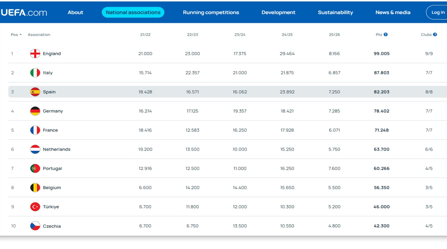 UEFA ülke puanı sıralamasında ilk 10 ülke şu şekilde yer aldı: